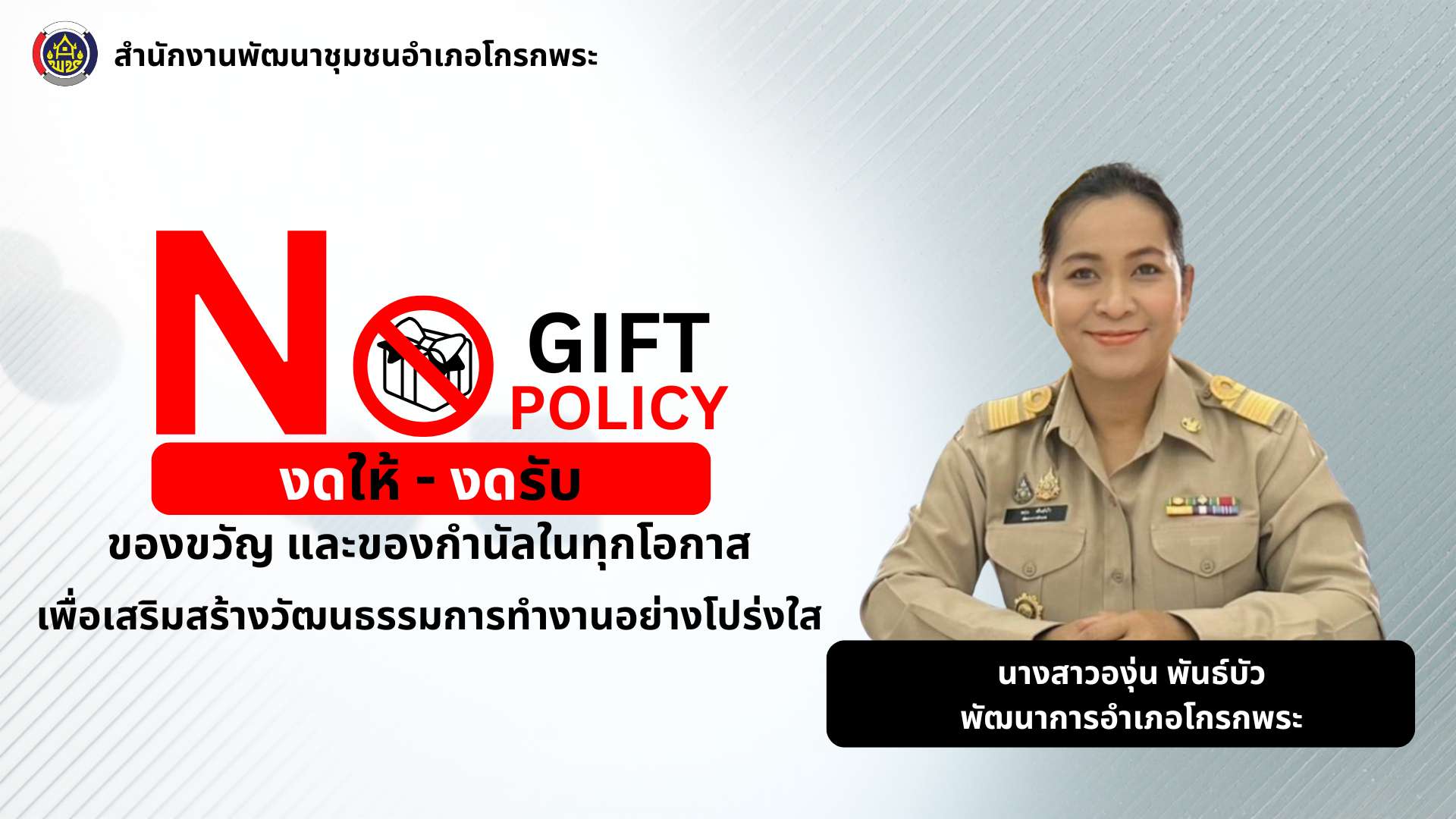 สำนักงานพัฒนาชุมชนอำเภอโกรกพระ นำโดยนางสาวองุ่น พันธ์บัว พัฒนาการอำเภอโกรกพระ และเจ้าหน้าที่พัฒนาชุมชนอำเภอโกรกพระ งดรับ งดให้ ของขวัญและของกำนัล ทุกชนิดจากการปฏิบัติหน้าที่ (No Gift Policy) ในขณะ ก่อน และ หลัง การปฏิบัติหน้าที่